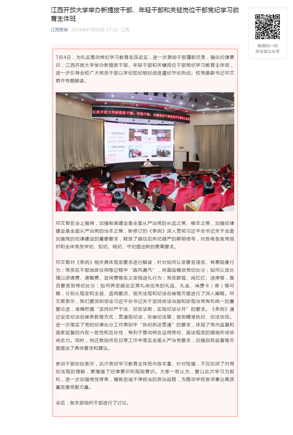 7月4日,为扎实推动党纪学习教育走深走实,进一步激励干部履职尽责,强化纪律意识,江南官方体育官方入口(China)官方网站举办新提拔干部、年轻干部和关键岗位干部党纪学习教育主体班,进一步引导全校广大党员干部以学纪知纪明纪促进遵纪守纪执纪。校党委副书记邓文君作专题解读。
