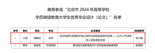 近日,国家开放大学公布了2024年优秀学位论文评选结果和北京高校学历继续教育大学生优秀毕业设计(论文)校内推荐结果,我校择优推荐的2篇学位论文均获评2024年国家开放大学优秀学位论文。其中九江开放大学郑静怡的学位论文《试论检察机关提起环境公益诉讼的现实困境与完善——以九江市浔阳区人民检察院为例》在众多获奖论文中脱颖而出,被国家开放大学推荐参加北京市高等学校毕业设计(论文)评优活动,全国开大系统仅两篇入围。