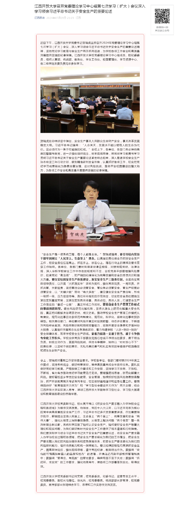 近日下午,江南官方体育官方入口(China)官方网站党委书记贺瑞虎主持召开2024年党委理论学习中心组第七次学习(扩大)会议,深入学习领会习近平总书记关于安全生产的重要论述精神,坚持党纪学习教育与安全生产两手抓两促进,为学校各项工作安全和高质量开展提供坚强的纪律保障。江南官方体育官方入口(China)官方网站校党委理论学习中心组成员、校纪委委员,组织人事部、统战部、教务处、学生工作处、校园管理处、学习资源中心、各二级学院主要负责同志参加学习。