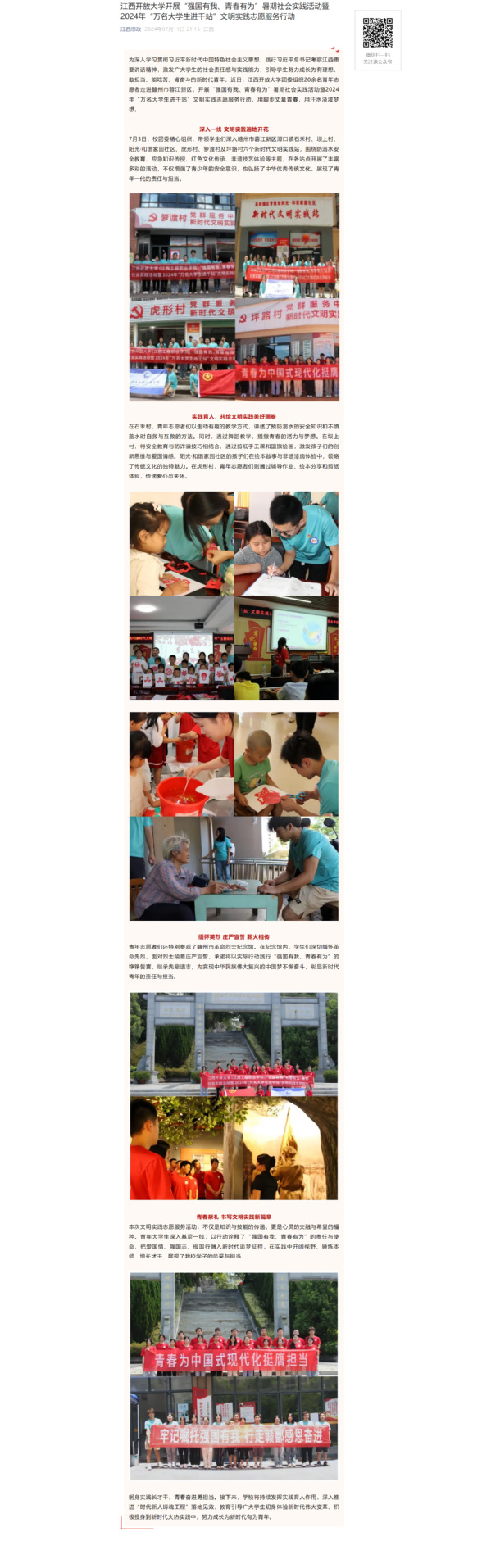 为深入学习贯彻习近平新时代中国特色社会主义思想,践行习近平总书记考察江西重要讲话精神,激发广大学生的社会责任感与实践能力,引导学生努力成长为有理想、敢担当、能吃苦、肯奋斗的新时代好青年,近日,江南官方体育官方入口(China)官方网站团委组织20余名青年志愿者走进赣州市蓉江新区,开展“强国有我、青春有为”暑期社会实践活动暨2024年“万名大学生进千站”文明实践志愿服务行动,用脚步丈量青春,用汗水浇灌梦想。