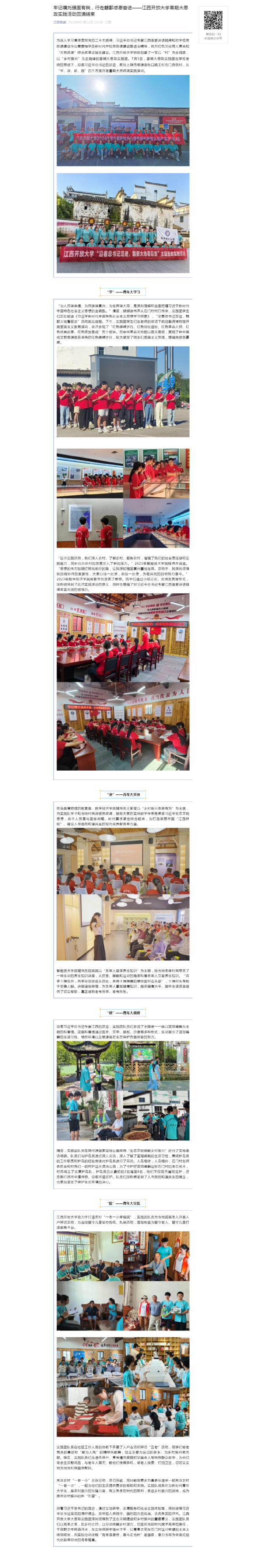 为深入学习宣传贯彻党的二十大精神、习近平总书记考察江西重要讲话精神和对学校思政课建设作出重要指示及新时代学校思政课建设推进会精神,助力红色文化育人高地和“大思政课”综合改革试验区建设。江南官方体育官方入口(China)官方网站积极组建了一支以“村”为主线路,以“乡村振兴”为主旋律的暑期大思政实践团。7月3日,暑期大思政实践团在学校老师的带领下,沿着习近平总书记的足迹,前往上饶市婺源县秋口镇王村石门自然村,从“学、讲、研、践”四个方面开展暑期大思政课实践活动。