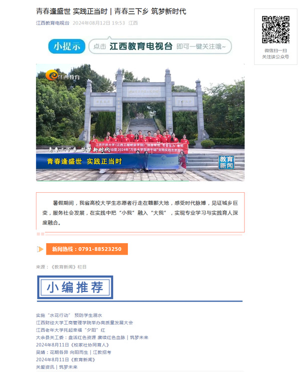 在这个充满活力的夏天,江南官方体育官方入口(China)官方网站团委积极响应国家号召,组织了一支充满朝气的暑期“三下乡”志愿服务队,深入乐安县牛田镇,开展了一系列富有成效的社会实践活动。这场以“青春奋进正当时 笃行致远绽芳华”为主题的实践活动,不仅展现了当代大学生的青春风采,更为乡村振兴注入了新的活力。近日,江西教育电视台报道我校开展暑期“三下乡”社会实践活动。