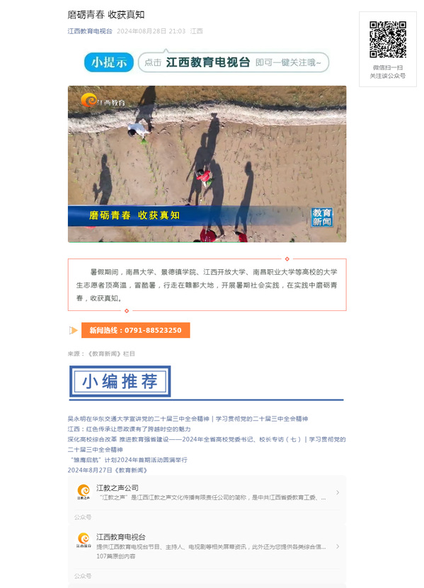 暑假期间,南昌大学、景德镇学院、江南官方体育官方入口(China)官方网站、南昌职业大学等高校的大学生志愿者顶高温,冒酷暑,行走在赣鄱大地,开展暑期社会实践,在实践中磨砺青春,收获真知。原文地址:https://mp.weixin.qq.com/s?__biz=MzA4NjQyNTEzNw==&mid=2649799838&idx=2&sn=35a9e04244b98060fa9c43a48d120280&chksm=86be1bf27fcf7b57800e5e5768cfe0e22493e67cfbd301a01ed1288b8dd7170e699298440a70&mpshare=1&scene=23&srcid=0829lYY6c1igVHiOZIrEYXRz&sharer_shareinfo=07721cd08d1d7121c9a9c980d166c117&sharer_shareinfo_first=b0bcc2d21ac1571902586375e668c06a#rd (责任编辑:罗楚颖)