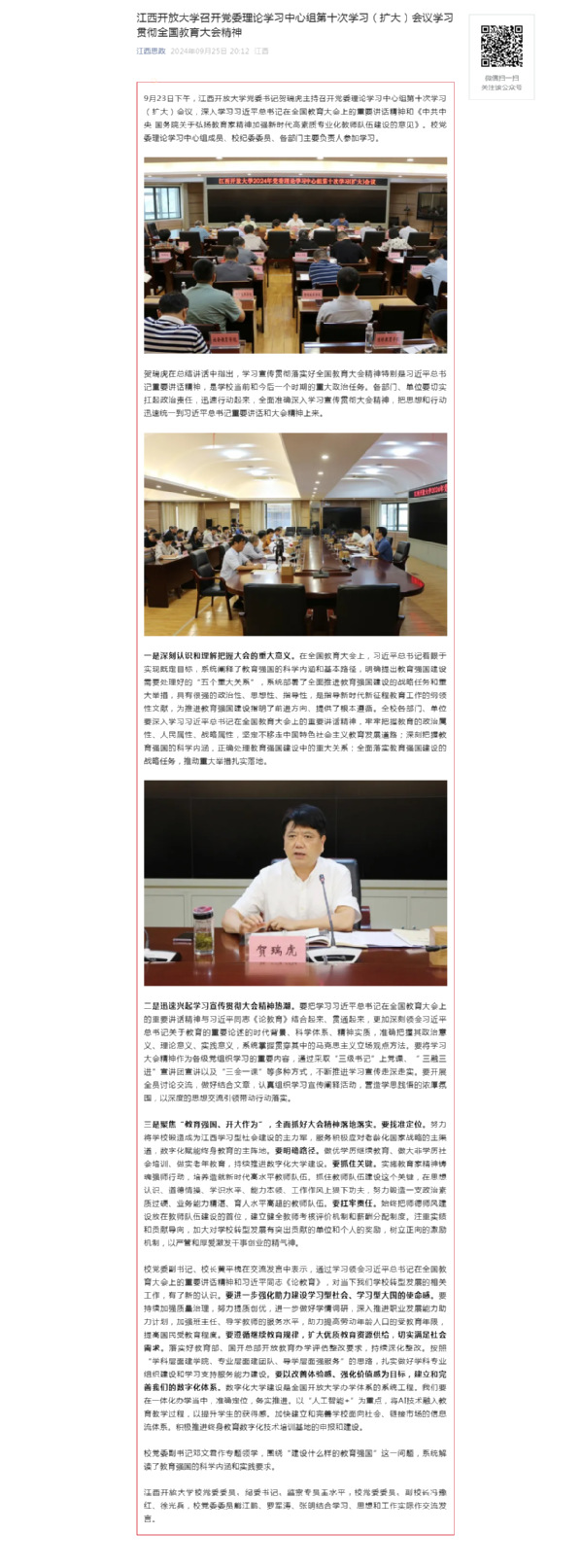 9月23日下午,江南官方体育官方入口(China)官方网站党委书记贺瑞虎主持召开党委理论学习中心组第十次学习(扩大)会议,深入学习习近平总书记在全国教育大会上的重要讲话精神和《中共中央 国务院关于弘扬教育家精神加强新时代高素质专业化教师队伍建设的意见》。校党委理论学习中心组成员、校纪委委员、各部门主要负责人参加学习。