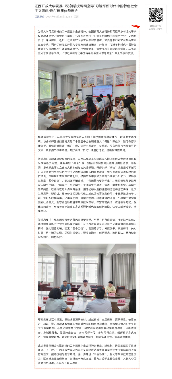 为深入学习贯彻党的二十届三中全会精神、全国教育大会精神和习近平总书记关于学校思政课建设的重要指示精神,扎实推进学校“习近平新时代中国特色社会主义思想概论”课程建设,近日,江南官方体育官方入口(China)官方网站党委书记贺瑞虎、党委副书记邓文君赴马克思主义学院,调研了解江南官方体育官方入口(China)官方网站思政课建设情况,并指导“习近平新时代中国特色社会主义思想概论”课集体备课会。校党委委员、宣传部部长张明陪同调研,马克思主义学院班子成员,“习近平新时代中国特色社会主义思想概论”课全体教师参加。