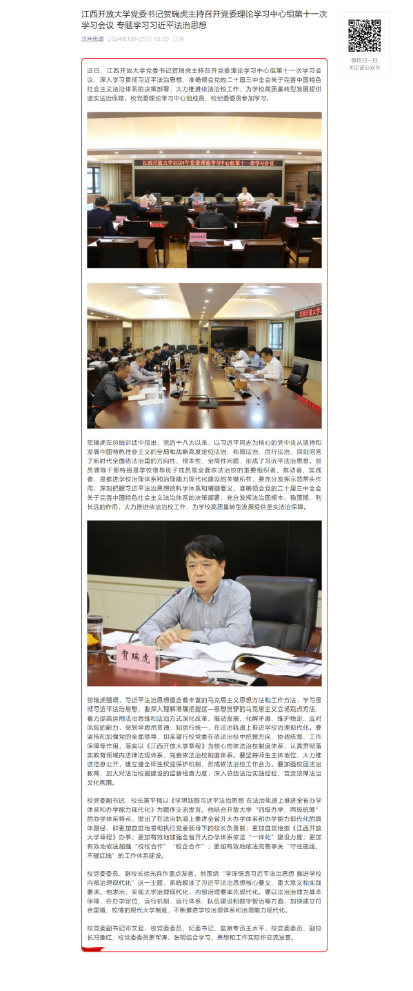近日,江南官方体育官方入口(China)官方网站党委书记贺瑞虎主持召开党委理论学习中心组第十一次学习会议,深入学习贯彻习近平法治思想,准确领会党的二十届三中全会关于完善中国特色社会主义法治体系的决策部署,大力推进依法治校工作,为学校高质量转型发展提供坚实法治保障。校党委理论学习中心组成员、校纪委委员参加学习。