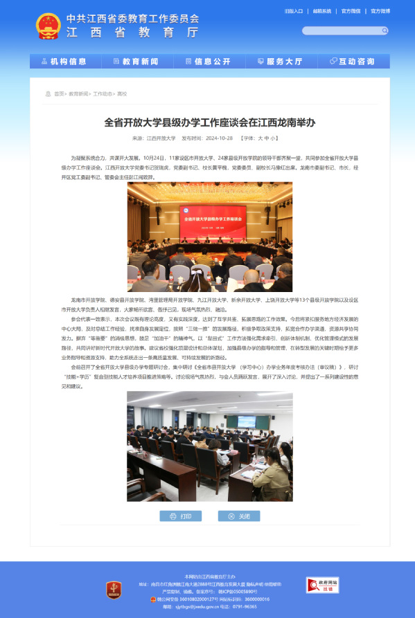 为凝聚系统合力,共谋开大发展。10月24日,11家设区市开放大学、24家县级开放学院的领导干部齐聚一堂,共同参加全省开放大学县级办学工作座谈会。江南官方体育官方入口(China)官方网站党委书记贺瑞虎,党委副书记、校长黄平槐,党委委员、副校长冯豫红出席。龙南市委副书记、市长,经开区党工委副书记、管委会主任彭江闽致辞。