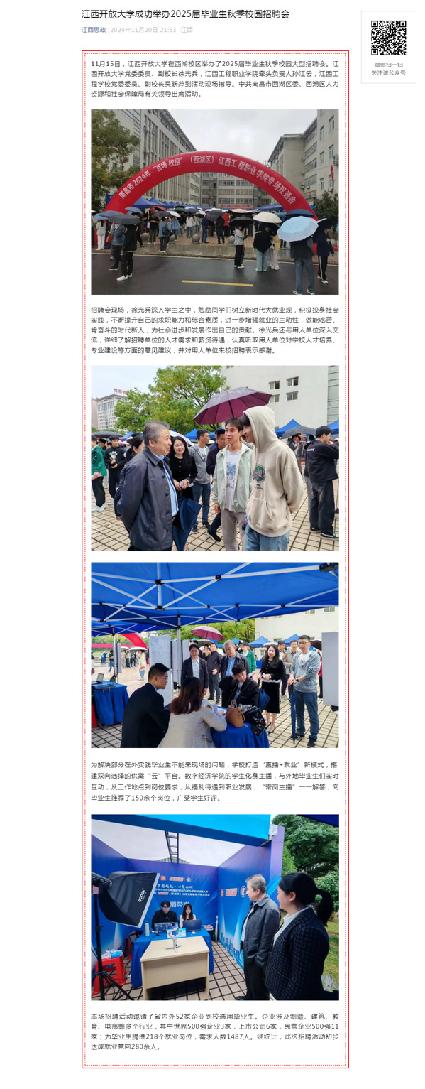 11月15日,江南官方体育官方入口(China)官方网站在西湖校区举办了2025届毕业生秋季校园大型招聘会。江南官方体育官方入口(China)官方网站党委委员、副校长徐光兵,江西工程职业学院牵头负责人孙江云,江西工程学校党委委员、副校长吴跃萍到活动现场指导。中共南昌市西湖区委、西湖区人力资源和社会保障局有关领导出席活动。