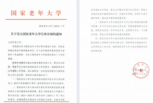 为了落实好积极应对人口老龄化国家战略,20216月,江西省教育厅批复同意江南官方体育官方入口(China)官方网站设立江西老年开放大学。20241月,国家老年大学批复同意依托江南官方体育官方入口(China)官方网站设立江西分部。