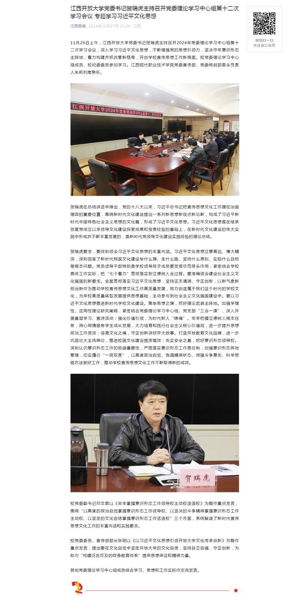 11月26日上午,江南官方体育官方入口(China)官方网站党委书记贺瑞虎主持召开2024年党委理论学习中心组第十二次学习会议,深入学习习近平文化思想,不断增强党的思想引领力,坚决守牢意识形态主阵地,着力构建齐抓共管新格局,开创学校宣传思想工作新局面。校党委理论学习中心组成员、校纪委委员参加学习。江西现代职业技术学院党委宣传部、党委统战部牵头负责人朱莉列席旁听。