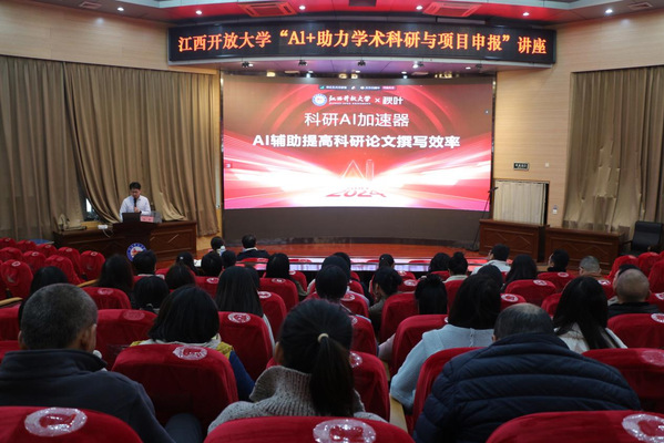 为贯彻落实党的二十届三中全会精神,推进教育数字化转型,同时提升我校科研水平,活跃学术氛围,12月4日上午,学校特邀秋叶集团AI智能工作台项目开发总监哈雷老师为专业技术人员做“AI+助力学术科研与项目申报”学术讲座。讲座由科研处(学习型社会研究院)和江西省远程教育学会联合主办。学校各部门、各学院共计70余人现场聆听,部分教师通过视频直播在线收看。