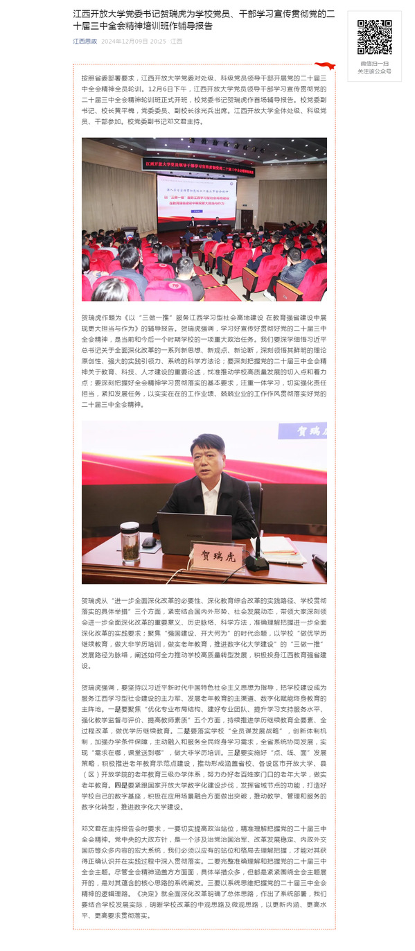 按照省委部署要求,江南官方体育官方入口(China)官方网站党委对处级、科级党员领导干部开展党的二十届三中全会精神全员轮训。12月6日下午,江南官方体育官方入口(China)官方网站党员领导干部学习宣传贯彻党的二十届三中全会精神轮训班正式开班,校党委书记贺瑞虎作首场辅导报告。校党委副书记、校长黄平槐,党委委员、副校长徐光兵出席。江南官方体育官方入口(China)官方网站全体处级、科级党员、干部参加。校党委副书记邓文君主持。