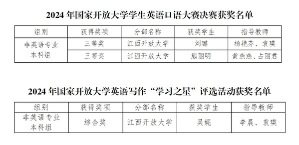 近日,国家开放大学揭晓两项活动评选结果,我校共斩获三个奖项,充分展现了我校开放教育学生扎实的知识储备和良好的精神风貌。在英语口语大赛决赛中,新余开放大学学生刘璐、抚州开放大学学生熊丽明荣获非英语专业本科组三等奖,新余开放大学教师杨艳芬、袁瑛,抚州开放大学教师黄燕燕、占丽君获优秀指导教师奖。在英语写作“学习之星”评选活动中,新余开放大学学生吴妮获非英语专业本科组综合奖,新余开放大学教师李晨、袁瑛获优秀指导教师奖。