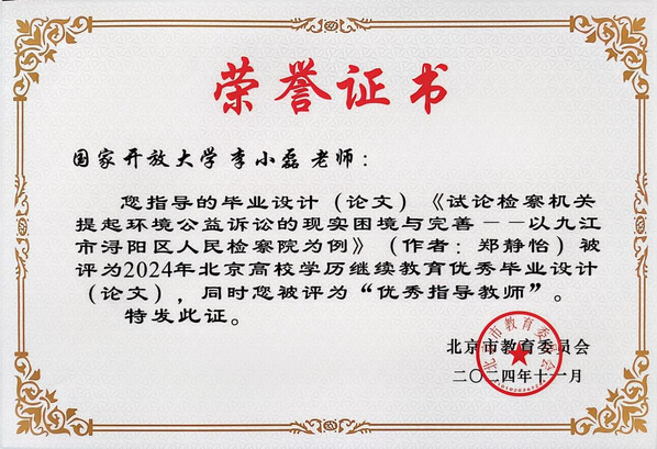 近日,北京市教育委员会公布了2024年北京高校学历继续教育大学生优秀毕业设计(论文)评选结果,我校法学专业学生郑静怡学士学位论文《试论检察机关提起环境公益诉讼的现实困境与完善——以九江市浔阳区人民检察院为例》获评“2024年北京高校学历继续教育优秀毕业设计(论文)”,指导老师李小磊被评为“优秀指导教师”。