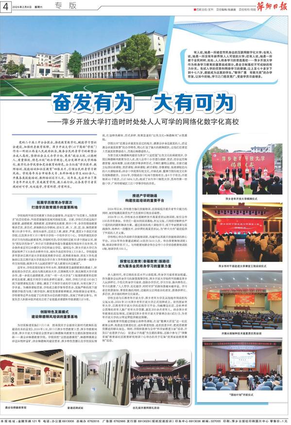2月8日,《萍乡日报》以《奋发有为 大有可为——萍乡开放大学打造时时处处人人可学的网络化数字化高校》为题,专版报道萍乡开放大学推进教育数字化,赋能学习型社会建设,加强终身教育保障的工作纪实。