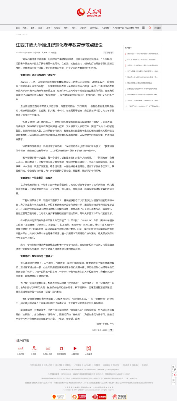 3月13日,人民网刊发《江南官方体育官方入口(China)官方网站推进智慧化老年教育示范点建设》,报道我校落实高标准老年大学实体示范中心建设具体举措。