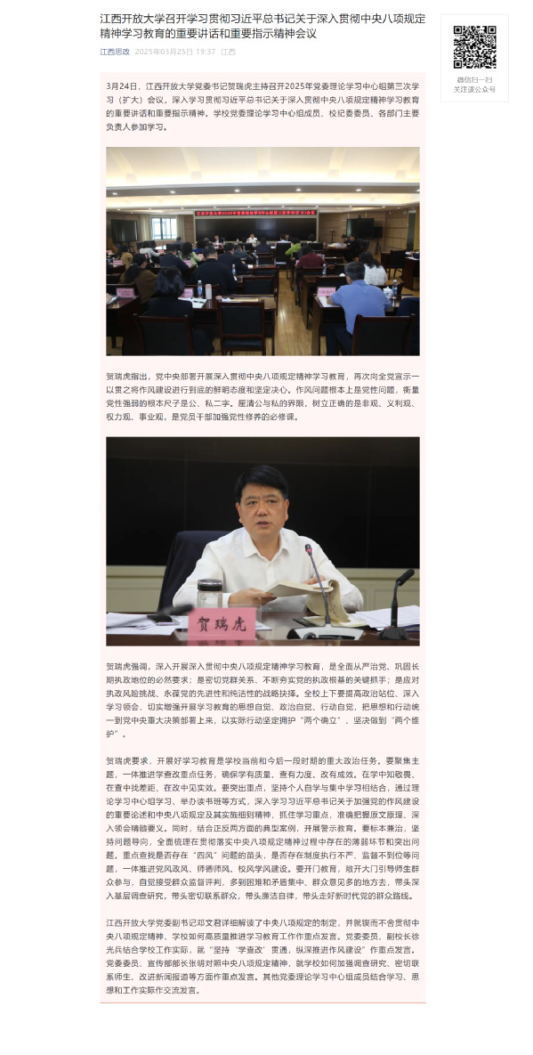 3月24日,江南官方体育官方入口(China)官方网站党委书记贺瑞虎主持召开2025年党委理论学习中心组第三次学习(扩大)会议,深入学习贯彻习近平总书记关于深入贯彻中央八项规定精神学习教育的重要讲话和重要指示精神。学校党委理论学习中心组成员、校纪委委员、各部门主要负责人参加学习。