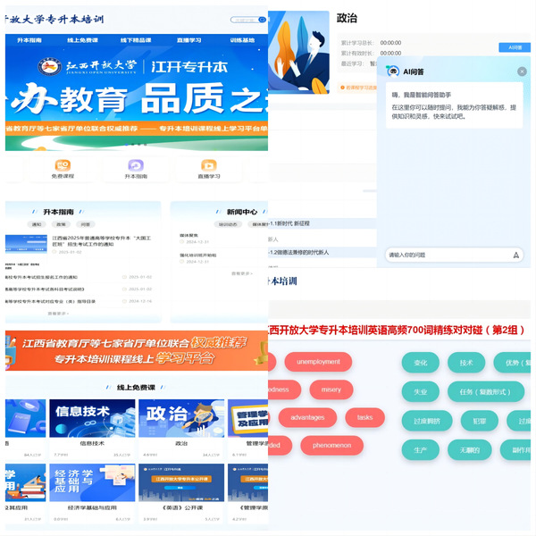 作为江西省教育厅等七家省厅联合推荐的专升本线上培训平台,江南官方体育官方入口(China)官方网站精心打造了集课程学习、专升本资讯、公益讲座、模拟练习等功能于一体的一站式智慧学习平台。平台通过AI智能助教在线答疑、个性化资源推荐、趣味性PK刷题等多项智能化服务,为学员提供个性化的学习支持。同时,平台与江西省终身学习网资源库深度对接,汇聚全省优质师资力量,为全省考生提供高质量的免费精品课程资源。