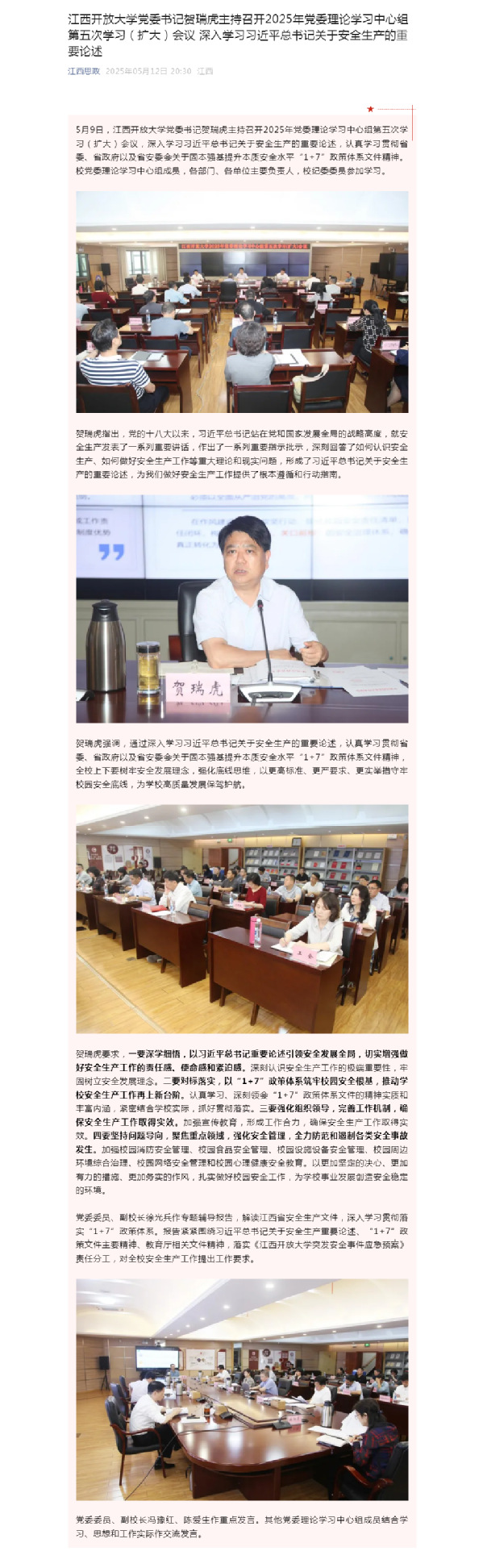 5月9日,江南官方体育官方入口(China)官方网站党委书记贺瑞虎主持召开2025年党委理论学习中心组第五次学习(扩大)会议,深入学习习近平总书记关于安全生产的重要论述,认真学习贯彻省委、省政府以及省安委会关于固本强基提升本质安全水平“1+7”政策体系文件精神。校党委理论学习中心组成员,各部门、各单位主要负责人,校纪委委员参加学习。