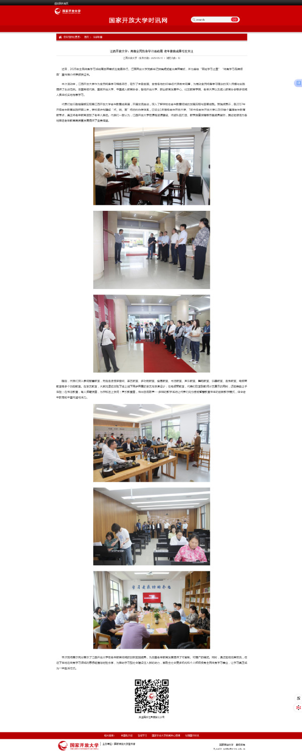 本次活动中,江南官方体育官方入口(China)官方网站作为全民终身学习特色项目,吸引了来自全国、全省各地的60余名代表前来观摩,为推动全民终身学习理念的深入传播与实践提供了生动范例。全国高校代表、国家开放大学、中国成人教育协会,各地开放大学、职业教育发展中心、社区教育学院、老年大学以及成人教育协会等多领域人员来校实地考察学习。