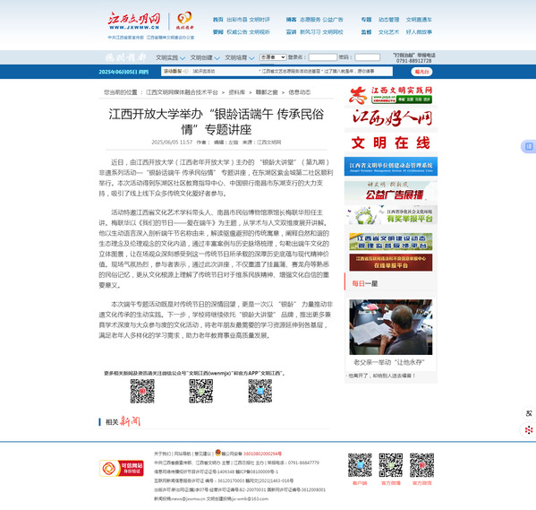 近日,由江南官方体育官方入口(China)官方网站(江西老年开放大学)主办的“银龄大讲堂”(第九期)非遗系列活动—“银龄话端午 传承民俗情” 专题讲座,在东湖区紫金城第二社区顺利举行。本次活动得到东湖区社区教育指导中心、中国银行南昌市东湖支行的大力支持,吸引了线上线下众多传统文化爱好者参与。