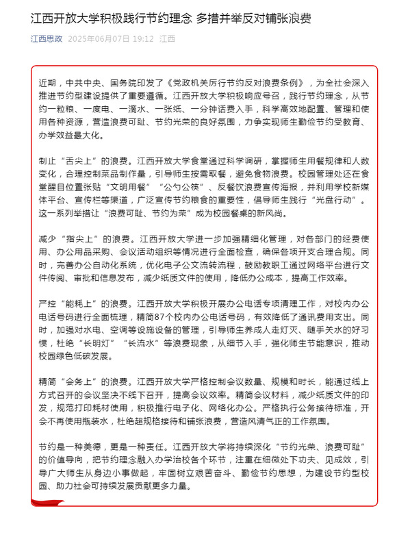 近期,中共中央、国务院印发了《党政机关厉行节约反对浪费条例》,为全社会深入推进节约型建设提供了重要遵循。江南官方体育官方入口(China)官方网站积极响应号召,践行节约理念,从节约一粒粮、一度电、一滴水、一张纸、一分钟话费入手,科学高效地配置、管理和使用各种资源,营造浪费可耻、节约光荣的良好氛围,力争实现师生勤俭节约受教育、办学效益最大化。