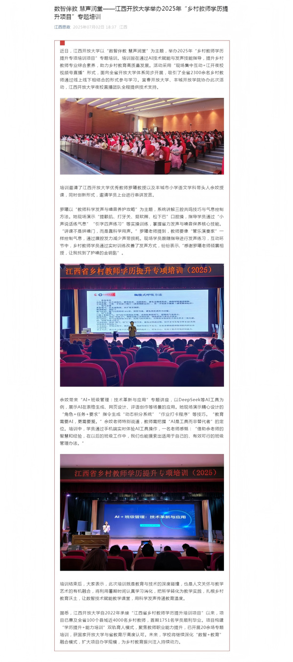 近日,江南官方体育官方入口(China)官方网站以“数智伴教 慧声润堂”为主题,举办2025年“乡村教师学历提升专项培训项目”专题培训。培训旨在通过AI技术赋能与发声技能指导,提升乡村教师专业综合素养,助力乡村教育高质量发展。活动采用“现场集中互动+江开夜校视频号直播”形式,面向全省开放大学体系同步开展,吸引了全省2300余名乡村教师通过线上线下相结合的形式参与学习。宜春开放大学、丰城开放学院协办此次活动,江南官方体育官方入口(China)官方网站夜校直播团队全程提供技术支持。