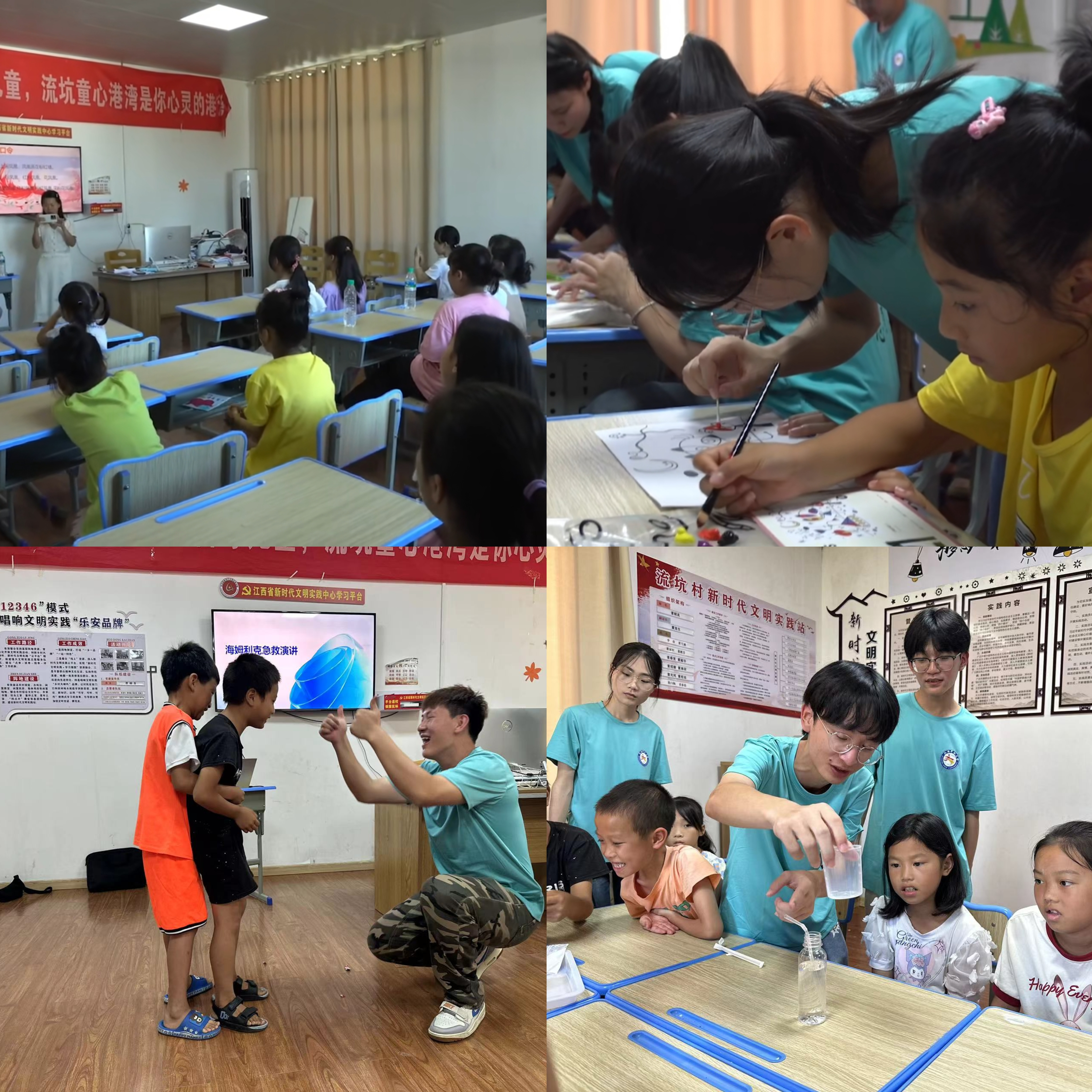 童心港湾:爱的涟漪荡漾。次日,志愿者们来到流坑村的“童心港湾”,与孩子们展开了一场充满温情的互动。志愿者们化身“魔法师”,通过趣味手工课、科学小实验等活动,为孩子们带来了欢笑与知识。此外,志愿者们还普及了《海姆立克急救法》和《民法典》,为孩子们传播急救与法律知识。