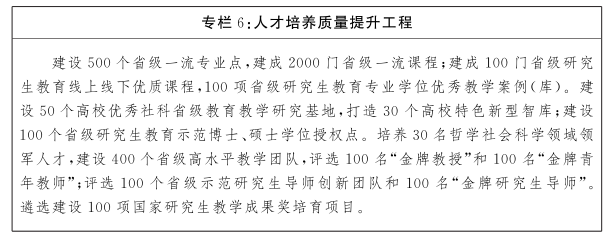 促进研究生教育量质齐升。扩大研究生培养规模,力争全省在校研究生规模增长60%左右。全力支持新增博士、硕士学位授予单位和学位授权点,力争全省博士、硕士学位授予单位数量增长30%左右,全省博士学位授权点数量增长60%左右。优化培养类型结构,稳步发展学术学位研究生教育,大力发展专业学位研究生教育。加强研究生教育创新,引导研究生提升知识创新能力、实践创新能力。建立以培养质量为核心指标的导师评聘和绩效评价机制,提高导师“导学导研”能力,推动导师下沉到人才培养、思政教育、科学研究一线。健全质量监督体系,强化对招生选拔、培养过程、学位授予、导师队伍等方面的质量管理,加强科学道德与学风建设。