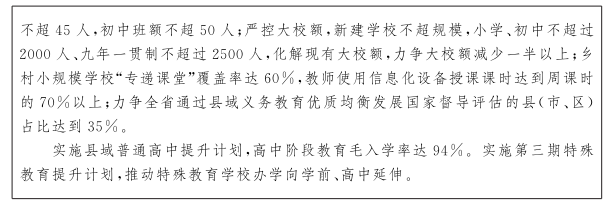 ——资源供给更加充裕。从学前到高中的15年基本公共教育全面普及。学前教育实现普及普惠,义务教育城乡一体化发展基本实现并迈向优质均衡,高中阶段教育实现多样化发展。残疾儿童少年享有更加适合的教育。国家职业教育创新发展高地基本建成,现代职业教育体系更加健全。高等教育布局结构进一步优化,“双一流”建设取得重要进展。服务全民终身学习的机制更加完善、体系更加健全。