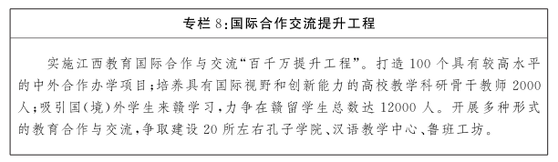 全面提升中外合作办学水平,积极引进国外知名大学、高水平职业院校和研究机构来赣合作办学,建立国际合作创新研究院。扎实推进“一带一路”江西教育行动计划升级版,稳妥推进境外办学,鼓励高校“走出去”,参与国际重大科学计划和科学工程,参与国际教育评价和国际专业认证。优化出国留学服务,做强江西国家公派地方合作项目。继续实施留学江西计划,优化留学生层次结构,依法依规加强留学生管理。进一步完善外籍教师聘任和管理制度。积极创新合作方式,持续办好产学研用国际会议(南昌),打造国际合作与交流品牌项目,探索后疫情时代基于信息平台的线上线下国际合作新模式。