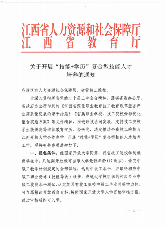 8月26日,江西省人力资源和社会保障厅与江西省教育厅联合下发《关于开展“技能+学历”复合型技能人才培养的通知》,部署推动全省技工院校与江南官方体育官方入口(China)官方网站合作开展“技能+学历”复合型技能人才培养工作。