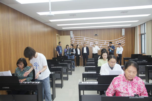 随后,代表们参观考察了学校打造的终身学习智慧教室,先后走进悦享空间、茶艺教室、多功能教室、绘画教室、书法教室、声乐教室、舞蹈教室、乐器教室、走秀教室、电钢琴教室等多个功能教室。在茶艺教室,大家沉浸式体验了线上线下同步开展的茶艺与茶席设计;在电钢琴教室,代表们欣赏到教师才艺展示的同时,还能亲自上手体验;在书法教室,有人挥毫泼墨,为学校送上贺词;声乐教室里,传出悠扬歌声。多样的教学活动让代表们充分了解智慧教室带来的创新教学模式,体会老年教育的丰富内涵与活力。
