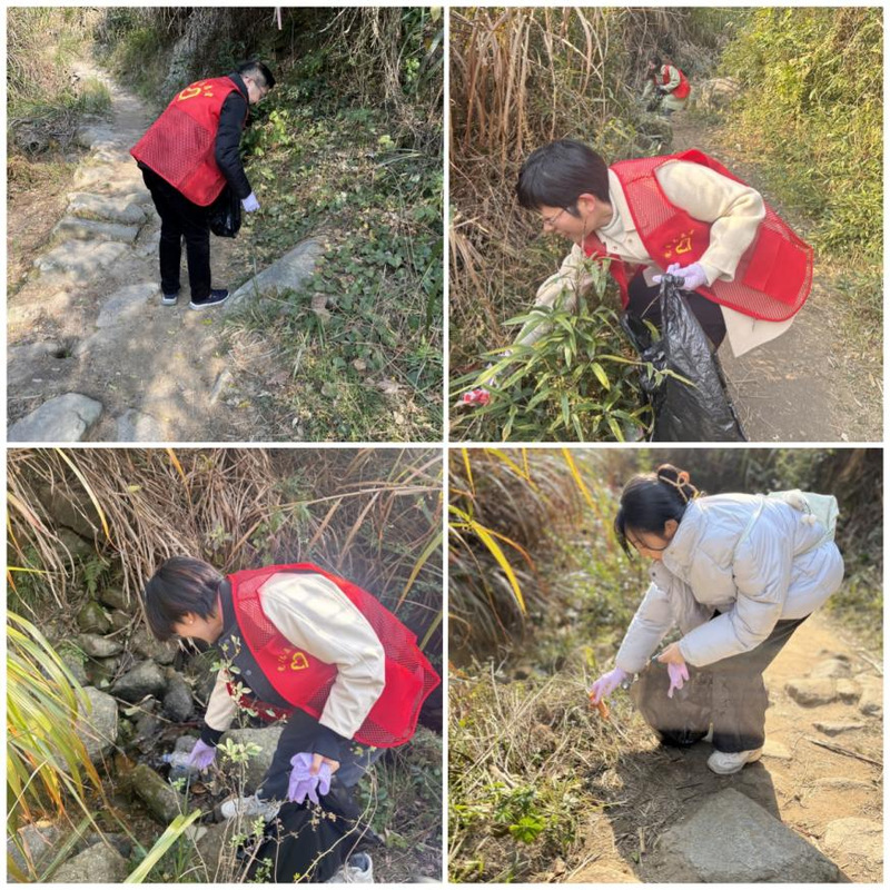 活动当天,机关党委五支部党员同志齐聚堎上村,身着志愿者服装,手持清洁工具,开展净山行动。大家齐心协力、不惧脏乱,将徒步道周边的垃圾一一清理干净,以实际行动积极践行着“爱护环境我先行”的承诺
