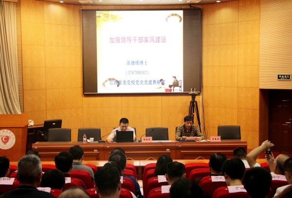 为加强学校领导干部家风建设,营造风清气正的政治生态,9月27日下午,学校在青山湖校区学术报告厅举办领导干部家风建设专题讲座,邀请省委党校党史党建教研部黄德锋博士讲授了一堂生动的家风课,同时这也是2018年学校专兼职纪检监察干部监督执纪业务培训班的一项内容。校党委书记易小明,校党委副书记黄平槐,党委委员、校纪委书记王水平,党委委员、副校长陈江鸿,学校全体处级干部,全体参训学员以及各党总支、党支部书记参加了讲座。讲座由校纪委办主任、监察审计处处长李春湖主持。