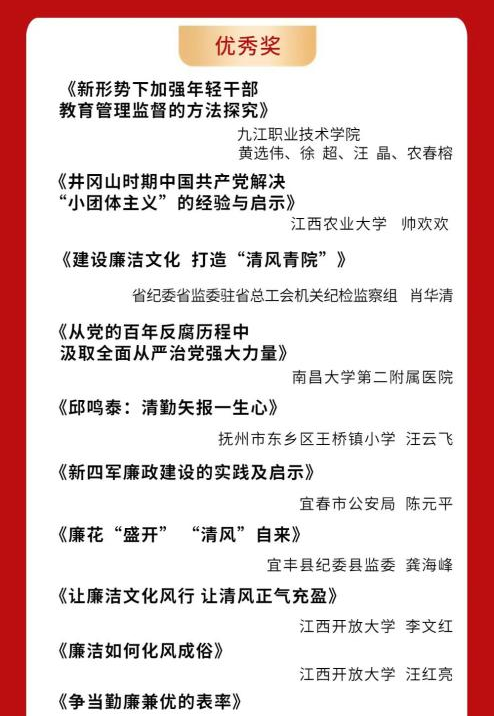 近日,由省纪委省监委宣传部与省委当代江西杂志社联合举办的“加强廉洁文化建设 全面建设勤廉江西”主题征文评审结果揭晓,共评选出一等奖2名、二等奖3名、三等奖5名、优秀奖10名。我校继续教育学院副院长李文红撰写的文章《让廉洁文化风行让清风正气充盈》和马克思主义学院院长汪红亮撰写的文章《廉洁如何化风成俗》,在全省263件参评作品中脱颖而出,分别获得优秀奖。