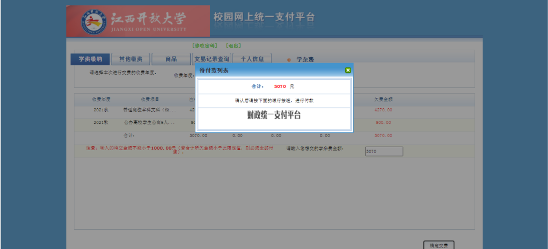 七、转入江西省财政统一支付平台后,再次确认缴款信息,无误后点击快速付款。