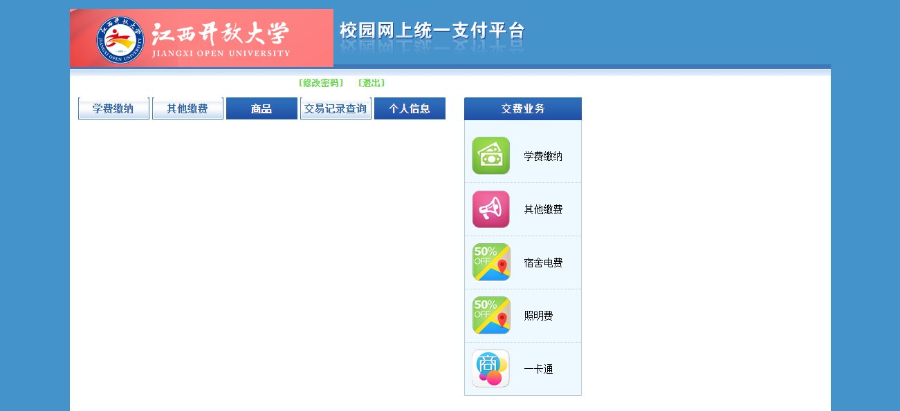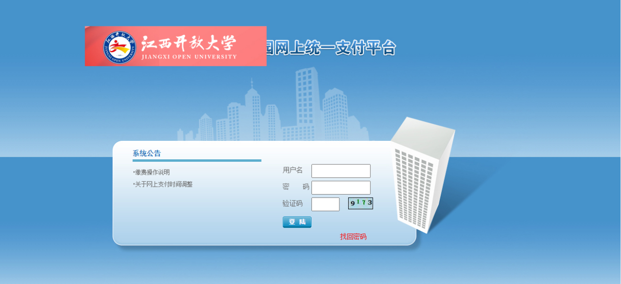 一、登录江西开放大学网站(http://www.donnaviagem.com),选择数字校园下的缴费查询系统,进入校园网上统一支付平台登录界面。