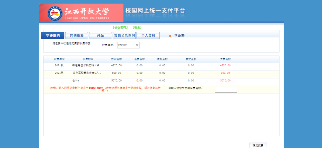 五、进入学费缴纳页面,选择缴费年度,核对缴纳项目,输入缴费的金额,无误后点击右下角“确认交费”。