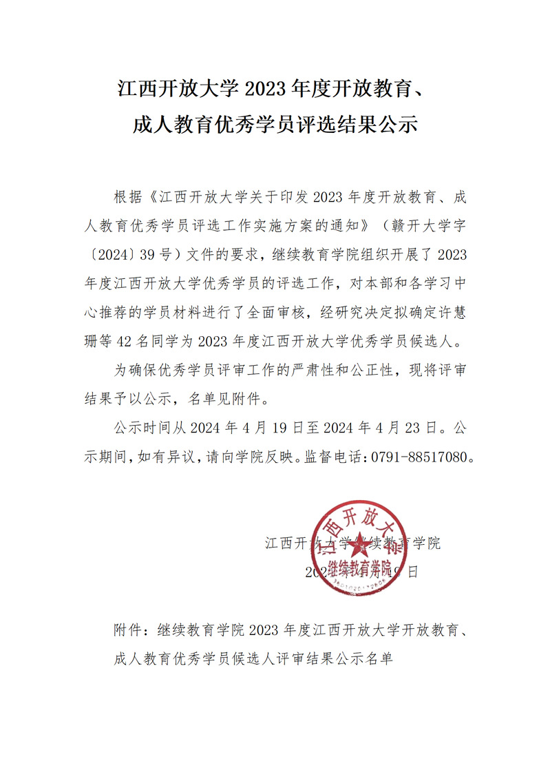 江南官方体育官方入口(China)官方网站2023年度开放教育、 成人教育优秀学员评选结果公示