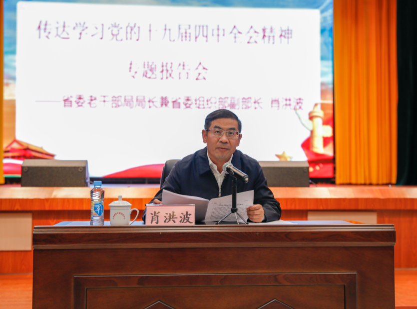 11月4日,省委老干部局召开传达学习党的十九届四中全会精神专题报告会。省委老干部局局长兼省委组织部副部长肖洪波作专题报告,他强调,要深入学习贯彻党的十九届四中全会精神,始终以习近平新时代中国特色社会主义思想为引领,不断增强“四个意识”、坚定“四个自信”、做到“两个维护”,确保四中全会精神入脑入心,结合老干部工作实际,用心用情做好新时代老干部工作,以高度的历史使命感和政治责任感,加快推进老干部工作创新发展。