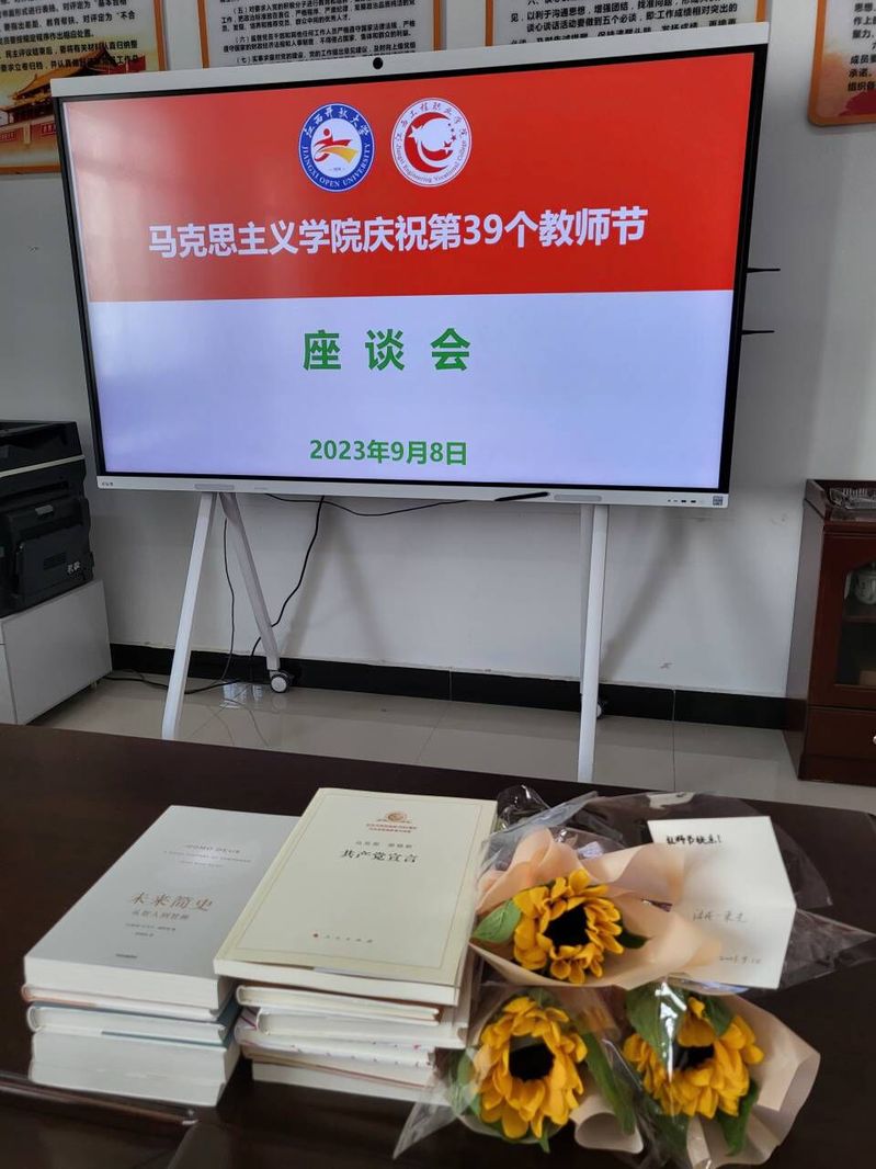 谈会伊始,学院为每位教职工送上一束向日葵,配以精致贺卡,上有学院教师、著名作家陈志宏亲笔书写的祝福语,向学院每位教职工致以最诚挚的节日祝福。教师是天底下最光辉的职业。一朵朵美丽的向日葵,寓意“忠诚、信念、自强不息、阳光开朗和积极向上”,代表学院教师忠于党的教育事业,坚持立德树人,全心全意为学生服务,用爱心浇灌成长,用知识托举希望,用信念筑牢思想。为深入推进“书香马院”建设,学院还购置一批马克思主义经典书籍及人文社科经典著作,在这个特殊时刻赠送给教师阅读。