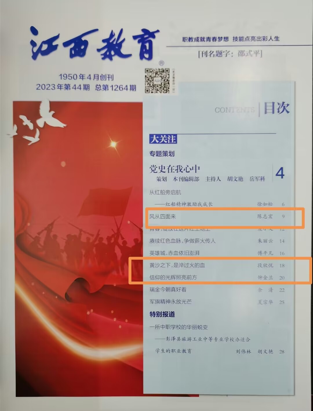 读史可以明智,知古方能鉴今。近日,我院教师陈志宏副教授指导2022级中文2班学生段欣悦撰写的党史故事《黄沙之下,是淬过火的血》,经严格审核,发表在《江西教育(职教版)》2023年11月号(总1264期)上。