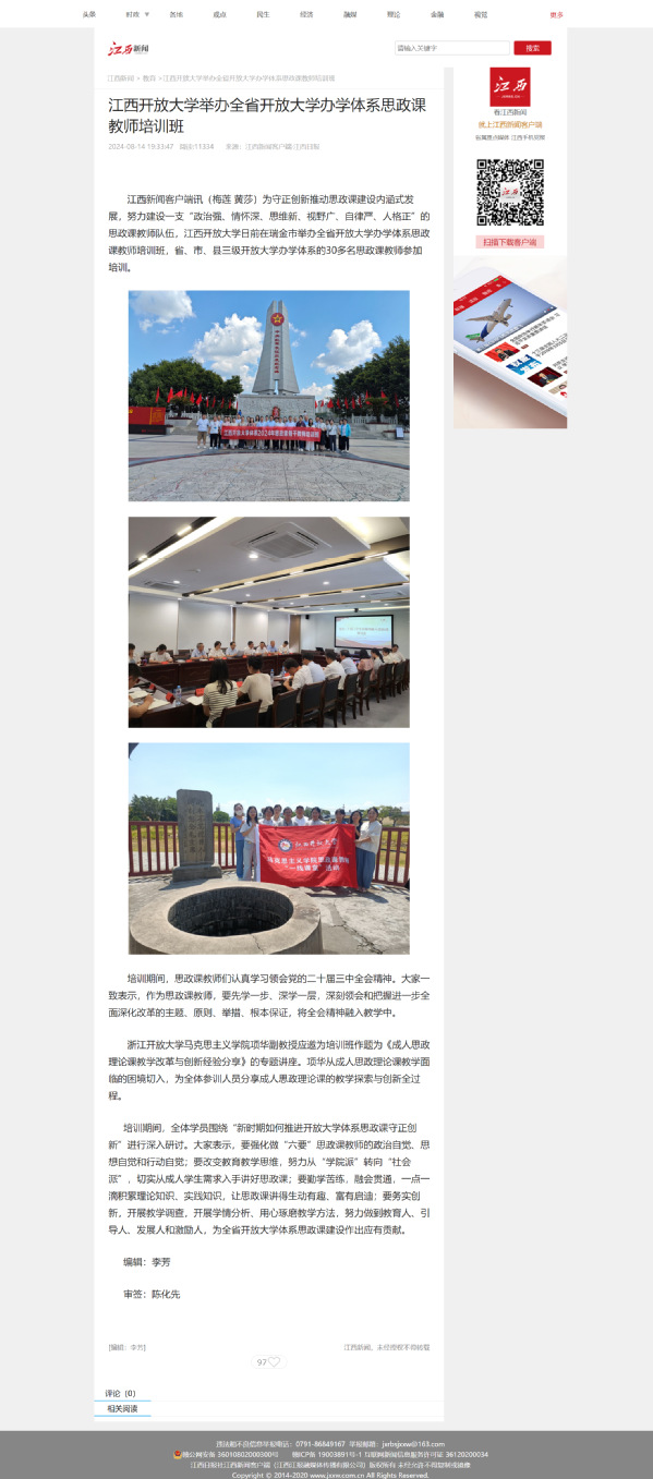为守正创新推动思政课建设内涵式发展,努力建设一支“政治强、情怀深、思维新、视野广、自律严、人格正”的思政课教师队伍,江南官方体育官方入口(China)官方网站日前在瑞金市举办全省开放大学办学体系思政课教师培训班,省、市、县三级开放大学办学体系的30多名思政课教师参加培训。
