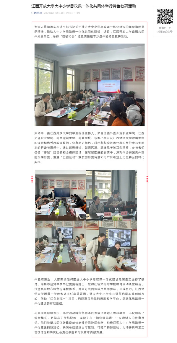 为深入贯彻落实习近平总书记关于推进大中小学思政课一体化建设的重要指示批示精神,推动大中小学思政课一体化共同体建设,近日,江南官方体育官方入口(China)官方网站邀请共同体成员单位,举行“巴黎和会”红色情景剧本沙盘体验特色教研活动。原文地址:https://mp.weixin.qq.com/s?__biz=MzI1OTM4MDMzMA==&mid=2247605525&idx=5&sn=347c7fc20c69bb8813c0a2f184bde718&chksm=eb40253fde89bce9c55dfefdea2a23ad3bd8b26444638cf6bba9
