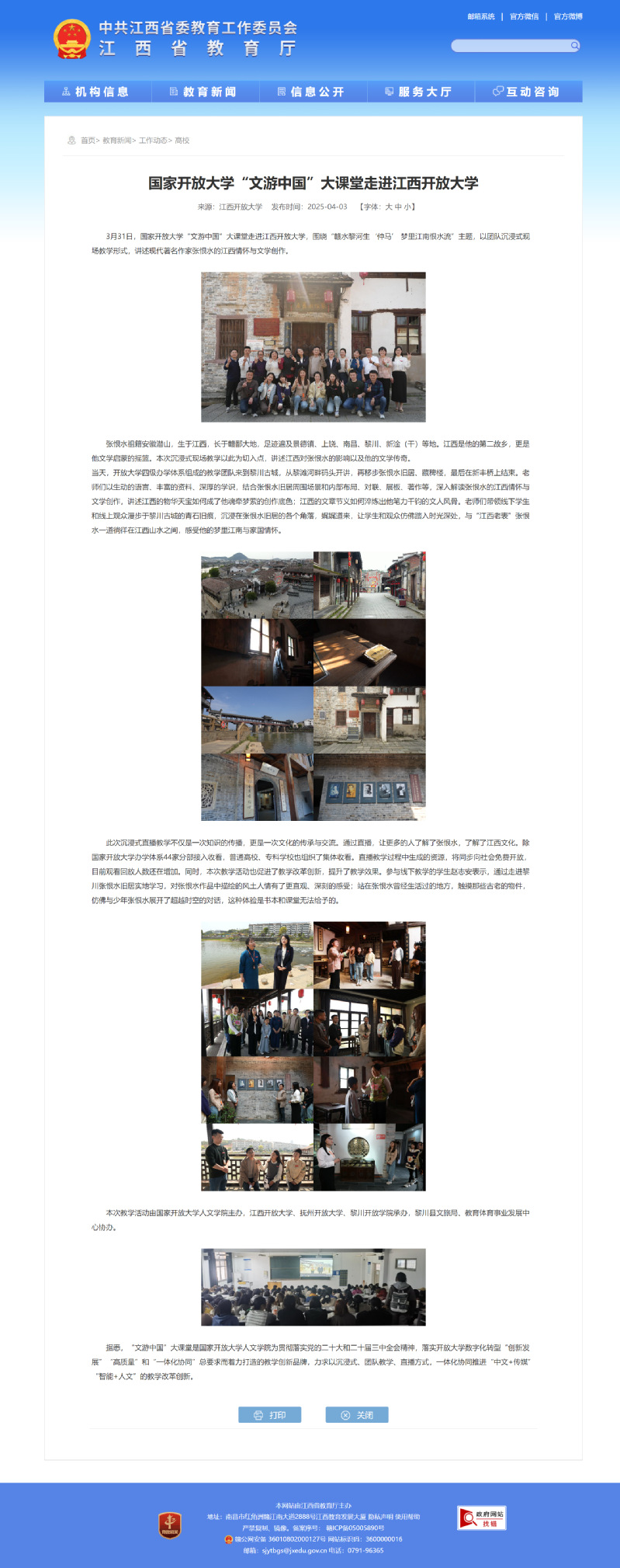 3月31日,国家开放大学“文游中国”大课堂走进江南官方体育官方入口(China)官方网站,围绕“赣水黎河生‘仲马’ 梦里江南恨水流”主题,以团队沉浸式现场教学形式,讲述现代著名作家张恨水的江西情怀与文学创作。