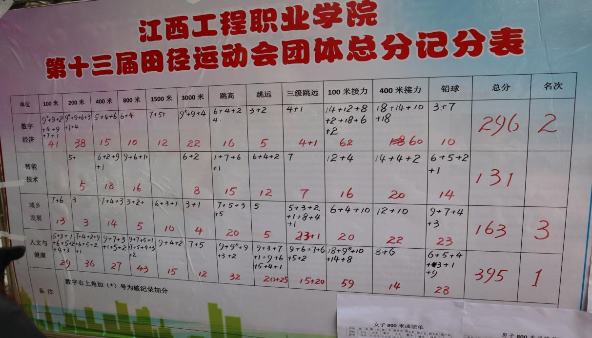 经过两天的角逐,我院在男女子200米、男女子800米、男女子4×100米、4×400米、女子三级跳、男子3千米、女子1500等项目中勇创佳绩,打破了多项学校历史最高记录并获得了团体总分第一的好成绩!