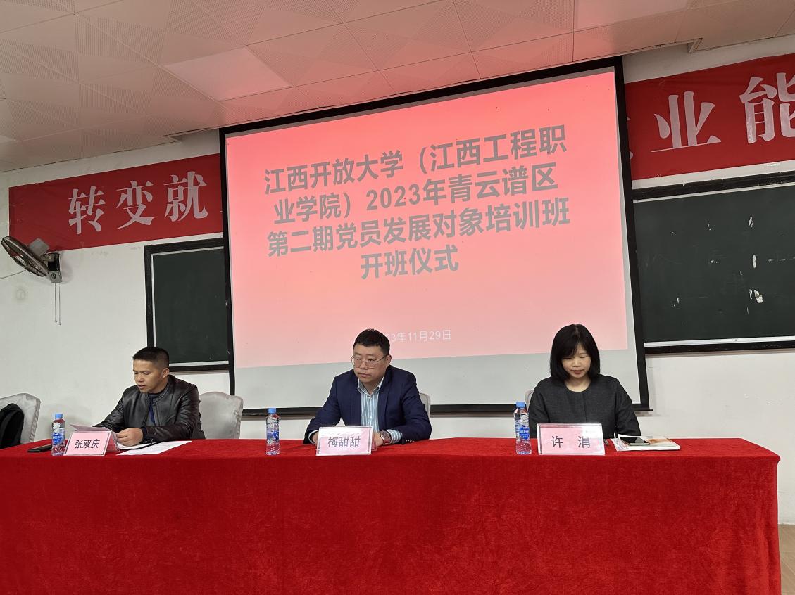 为深入学习习近平新时代中国特色社会主义思想和党的二十大精神,贯彻落实新时代党的建设总要求,做好党员发展和教育工作,11月29日下午,学院在1101教室举办了2023年第二期党员发展对象培训班开班仪式。学院党委书记梅甜甜、副院长许涓、副院长张双庆出席开班仪式并讲话,学生党支部书记蔡欣及32名学生党员发展对象参加。开班仪式由学院副院长许涓主持。