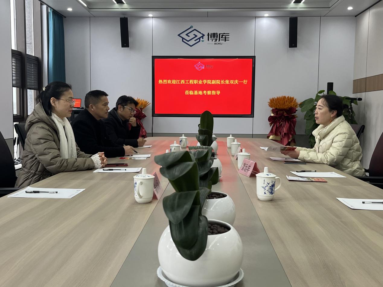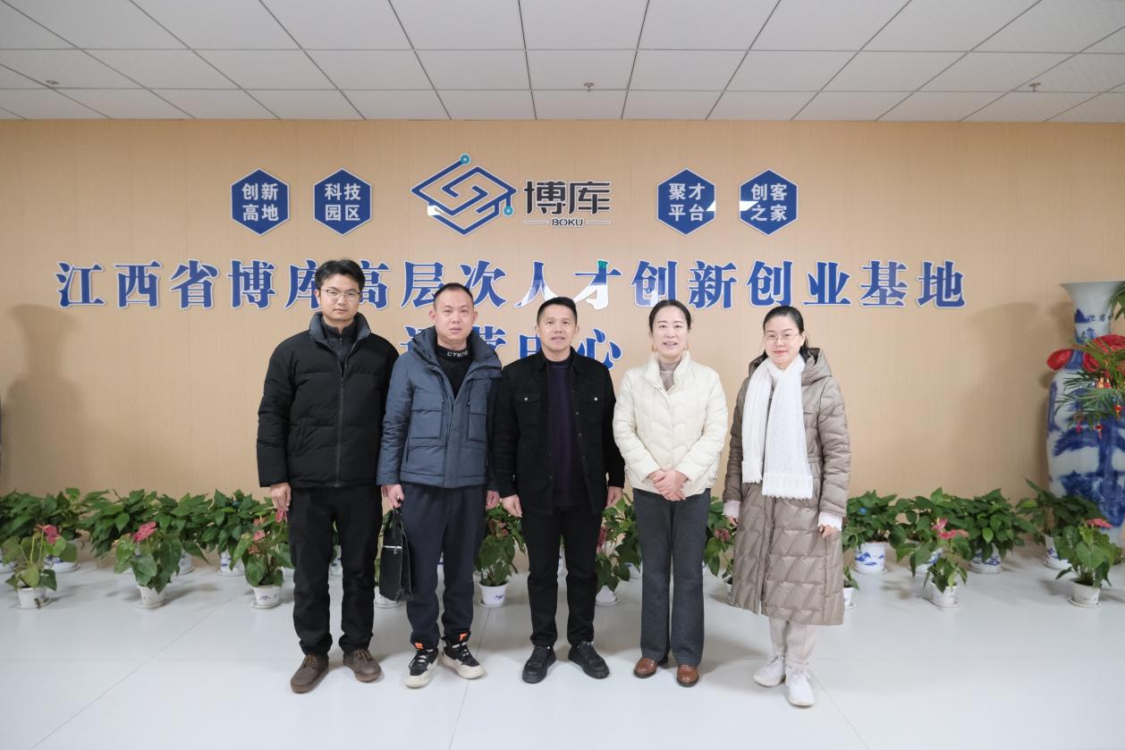 2月29日上午,江南官方体育官方入口(China)官方网站人文与健康学院党委委员、副院长张双庆、外语与教育系主任吴思颖、培训部干事詹水标、辅导员陈怡均一行4人赴江西省博库高层次人才创新创业基地博库信息技术有限公司开展访企拓岗相关工作。