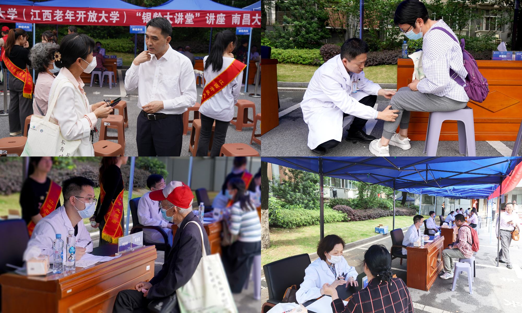 在讲座主会场,江西老年开放大学东湖校区设立了大型中西医义诊区域,邀请了南大二附医院心血管内科、神经内科、消化内科神经外科、耳鼻喉科、中医科、内分泌代谢科7个科室专家,为参加讲座的中老年朋友提供免费义诊服务。义诊医生们细致地为大家进行健康查体,耐心解答各种健康养生问题,并根据义诊老年人不同体质和健康状态,科学提供了养生保健、疾病防治等意见。